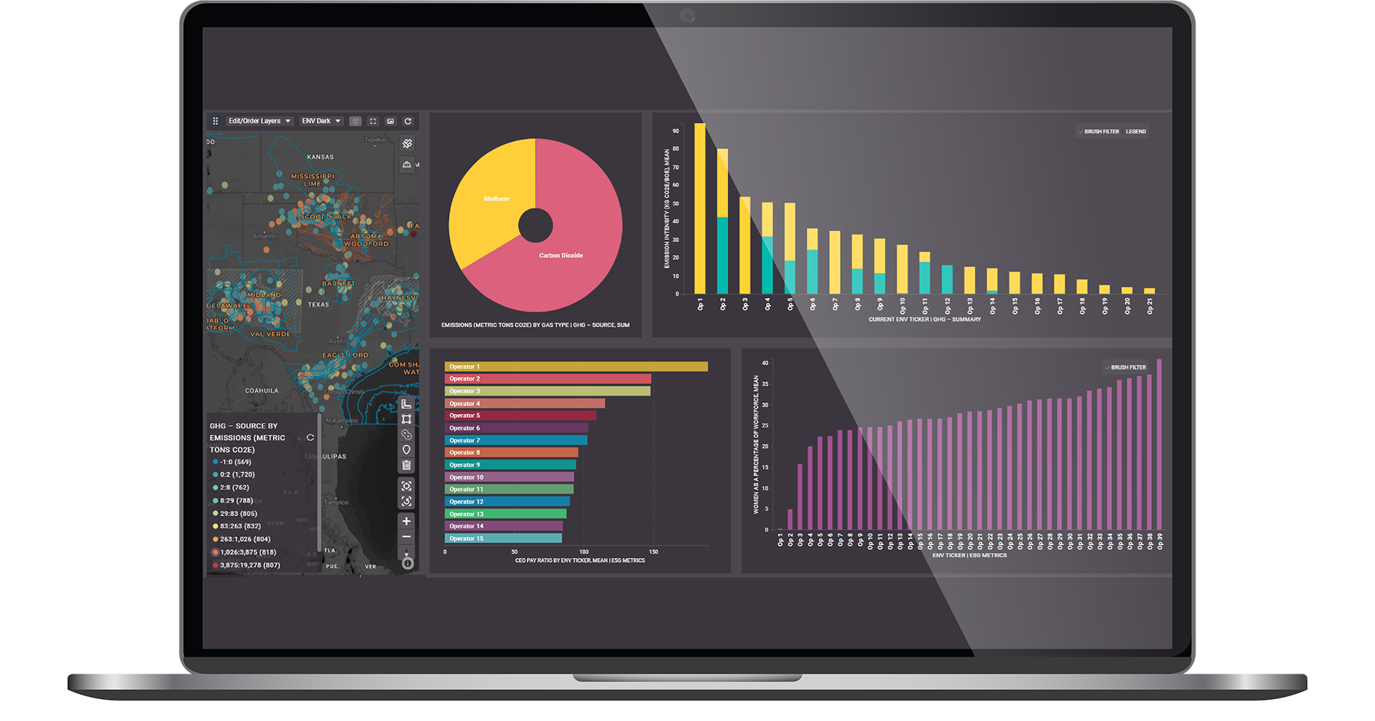 Enverus ESG Analytics lets users track emissions intensity, flaring rates, land use and water use via satellite-enabled proprietary analytics alongside industry-leading objective data related to production and economics.